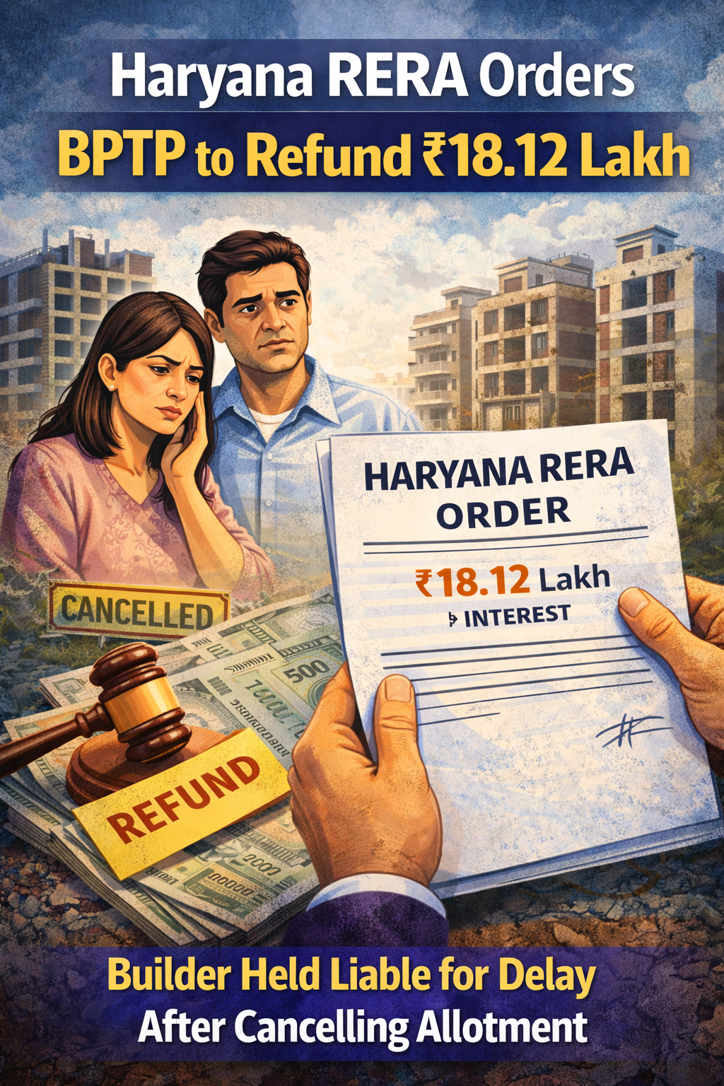 Dated on: Friday 3rd April 2026Haryana RERA has instructed BPTP Limited to refund ₹18.12 lakh to a homebuyer along with interest, citing delay in project delivery. The buyer had booked a property but did not receive possession within the promised timeframe. The developer had cancelled the allotment due to alleged non-payment, but the authority ruled that the delay and failure to refund made the builder liable. It also dismissed the argument that the complaint was time-barred, calling it an ongoing issue. The order highlights that builders must fulfill commitments and protects homebuyers from unfair practices in the real estate sector.